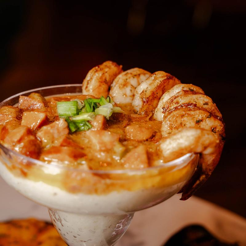 Sautéed shrimp in a creamy Cajun sauce with andouille sausage over grits.
