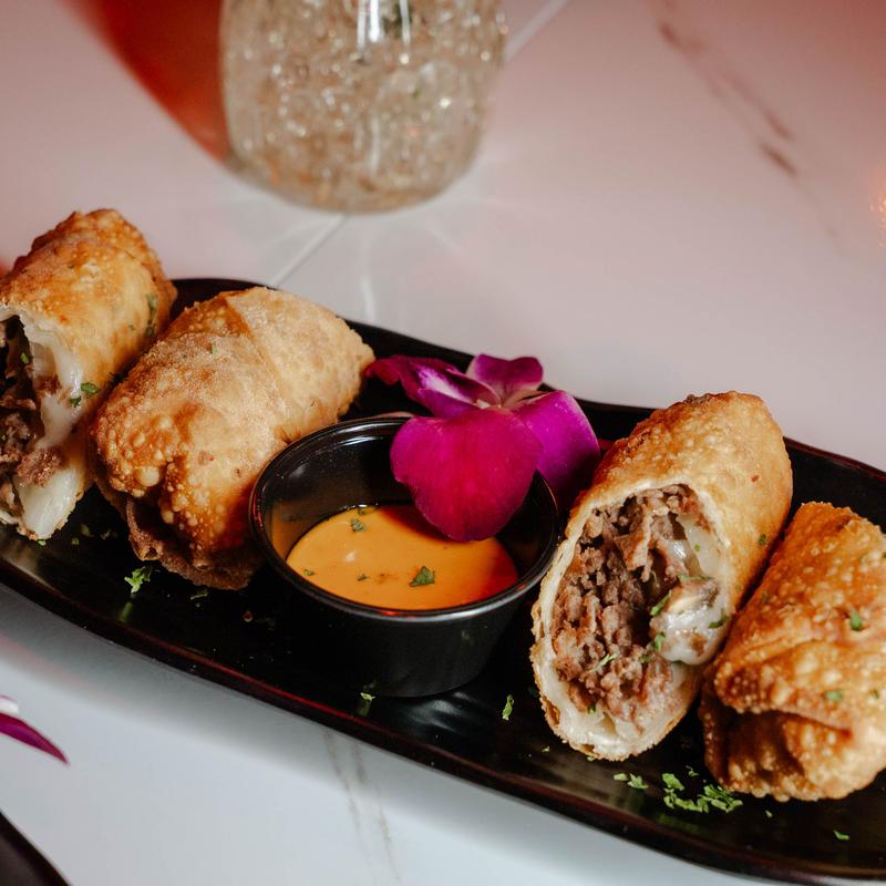 50 $175.00 | 100 $325.00 | 150 $430.00 • Crispy egg rolls filled with Philly beef steak, peppers, onions, mushrooms, and provolone, served with our signature dipping sauce.