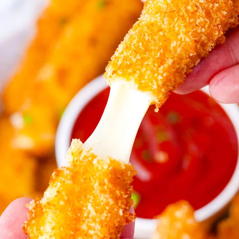Golden-fried mozzarella with a crispy seasoned coating, served with a side of marinara for dipping.