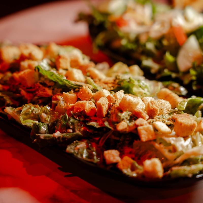 Crisp romaine with Caesar dressing*, shaved Parmesan, and croutons.