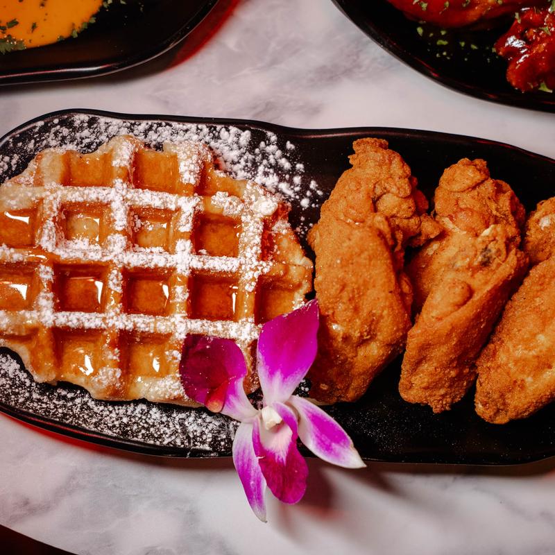 Crispy fried chicken wings served with a Liège waffle (Belgian waffle infused with caramelized pearl sugars).
