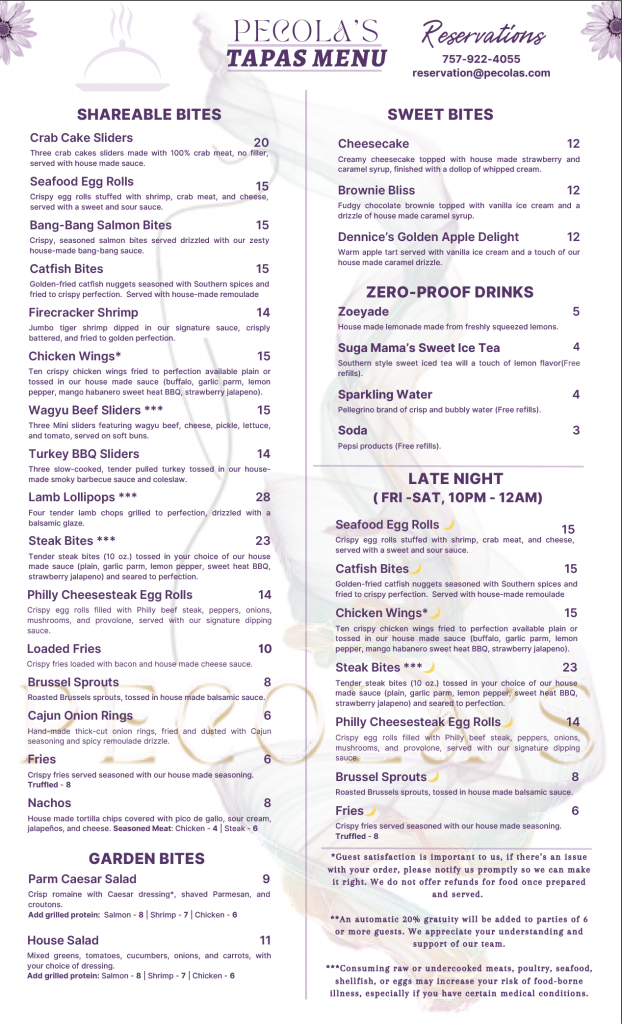 Welcome to Pecola’s, where Hampton’s vibrant scene meets the rich flavors of shisha and exquisite tapas. Our cozy ambiance is dedicated to quality, diversity, and the art of dining. Secure your table today and embark on a flavorful journey.